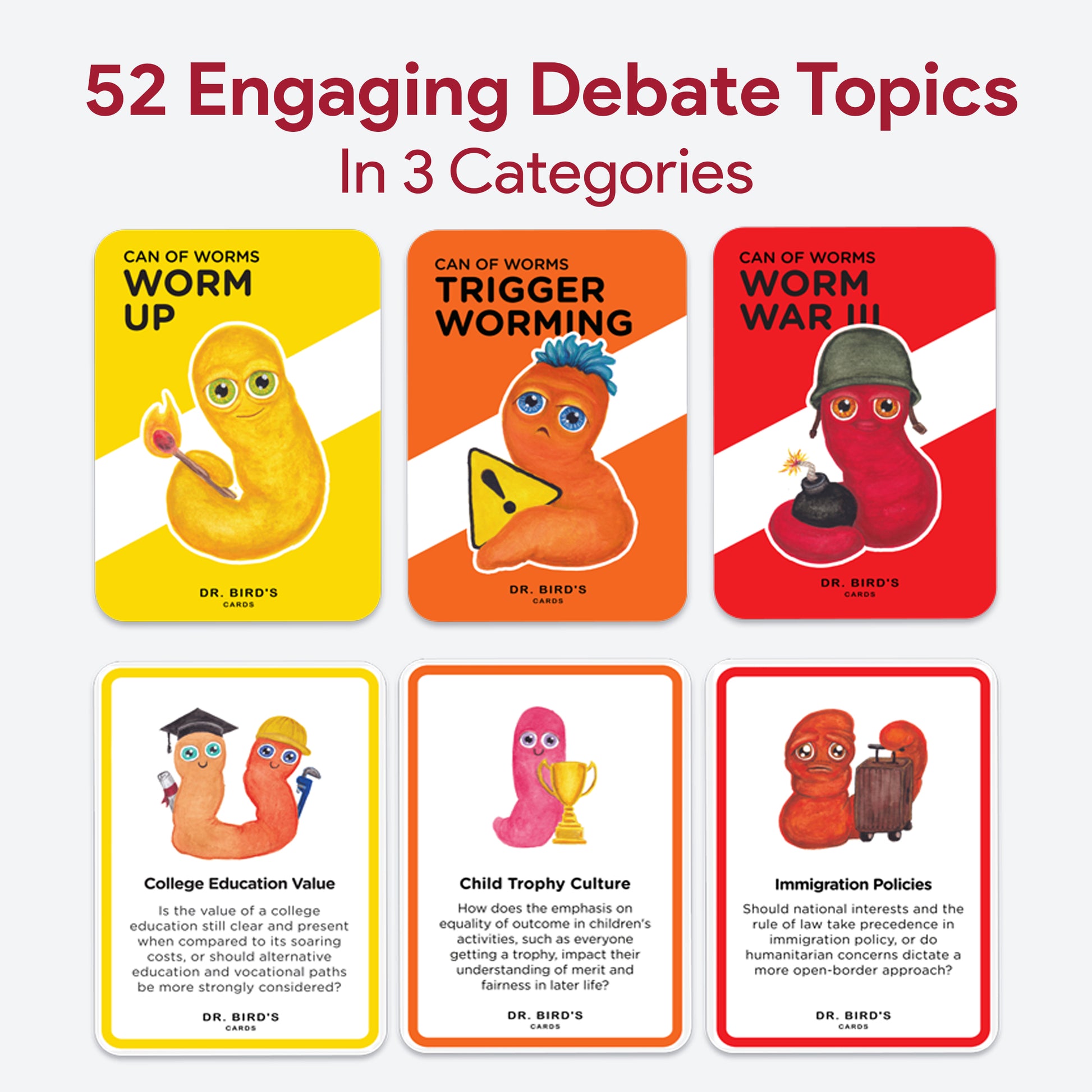 - A WHOLE LOT OF WORMS: Humorous and endearing worms on each card to lighten the vibe as the conversation intensifies. Three levels of triggering topics, from Worm Up, to Trigger Worming, to full blown Worm War III.