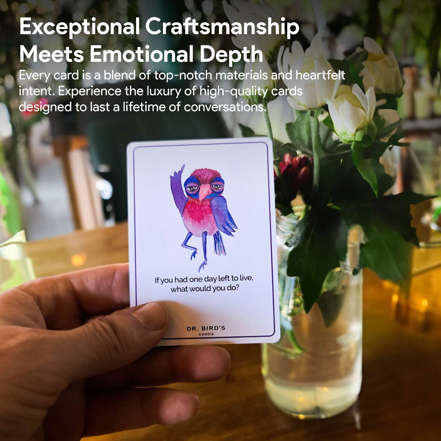 In a world distracted by screens and inauthentic interactions, Dr. Bird's Date Deck offers a refreshing return to genuine connections. We’ve crafted conversation starter cards as a tool to help you build and strengthen meaningful relationships in a wholesome way, as our ancestors did, by asking the right questions and getting to the heart of our shared values.