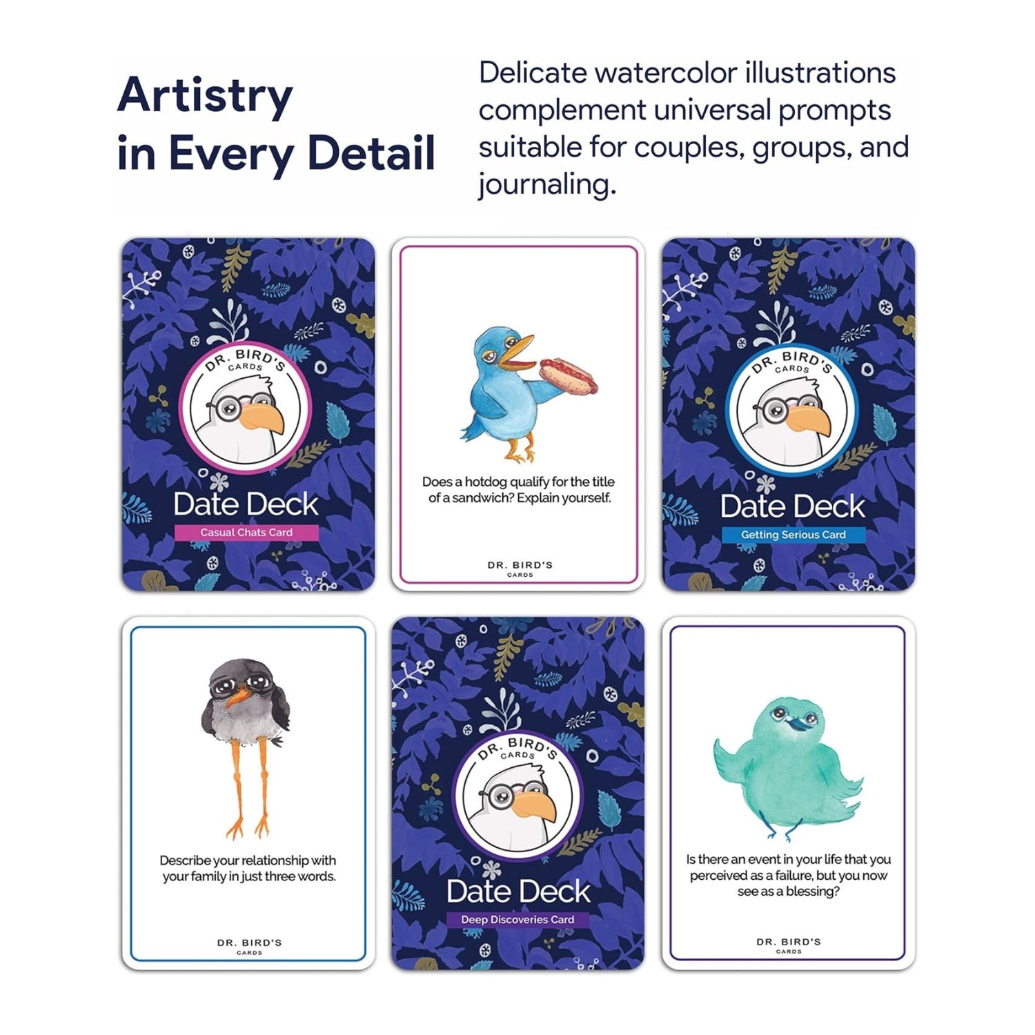 Dr. Bird's Date Deck is more than just a card game; it's a journey back to the heart of what makes us human—our ability to connect, love, and understand each other. Each card has been illustrated with a watercolor painting of a bird. This adds a relatable human touch to the game. It is a reminder not to take things too seriously, enjoy a laugh, and accept our imperfections, as it is part of our shared experience.